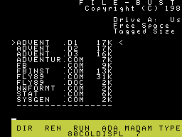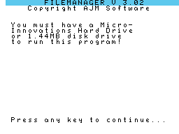 File Manager 2.1 (Disk) - Multi-purpose file and disk utility. Allows formatting of disk and DDP's, block copy, file copy, uses all expansion RAM for copying. |