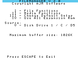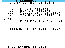 File Manager 2.0 (Disk) - Multi-purpose file and disk utility. Allows formatting of disk and DDP's, block copy, file copy, uses all expansion RAM for copying. |