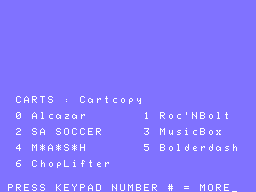 Game Disk #30 (Disk) - Collection of cartridge games includes: Alcazar, Roc N' Bolt, Super Action Soccer, Music Box Demo, M.A.S.H., Boulder Dash and Choplifter. Saved in CopyCart+ 2.0 format. |
