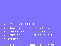 Game Disk #10 (Disk) - Collection of cartridge games includes: Dukes of Hazzard, Tomarc the Barbarian, Grog's Revenge, War Room, Venture, Oil's Well, and Gyruss. Saved in Copycart+ 2.0 format. |