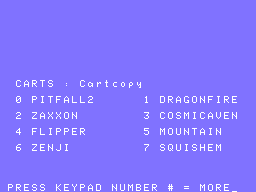 Game Disk #18 (Disk) - Collection of cartridge games includes: Pitfall II, Zaxxon, Flipper Slipper, Zenji, Dragonfire, Cosmic Avenger, Mountain King, and Squish 'Em. Saved in Copycart+ 2.0 format. |