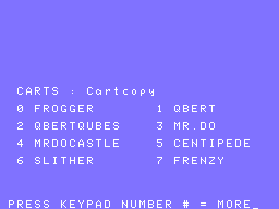 Game Disk #11 (Disk) - Collection of cartridge games includes: Frogger, QBert, Qbert's Qubes, Mr. Do, Mr. Do's Castle, Centipede, Slither, and Frenzy. Saved in Copycart+ 2.0 format. |