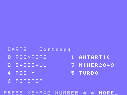 Game Disk #20 (Disk) - Collection of cartridge games includes: Roc 'N Rope, Antartic Adventure, Baseball, Miner 2049er, Rocky, Turbo, and Pitstop. Saved in Copycart+ 2.0 format. |