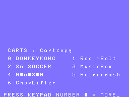 Game Disk #21 (Disk) - Collection of cartridge games includes: Donkey Kong, Roc 'N Bolt, Super Action Soccer, Music Box, M.A.S.H., Boulder Dash, and Choplifter. Saved in Copycart+ 2.0 format. |