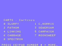 Game Disk #23 (Disk) - Collection of cartridge games includes: Slurpy, Chuck Norris, Fathom, Sewer Sam, Linking Logic, Campaign '84, Cabbage Patch Adventures in the Park, Moonsweeper, and Spectron. Saved in Copycart+ 2.0 format. |
