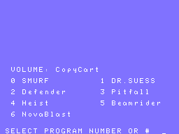 Game Disk #24 (Disk) - Collection of cartridge games includes: Smurf Paint & Play, Heist, Nova Blast, Dr. Seuss Fix Up The Mix Up Puzzler, Defender, Pitfall, Beamrider, and Nova Blast. Saved in Copycart+ 2.0 format. |