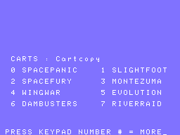 Game Disk #25 (Disk) - Collection of cartridge games includes: Space Panic, Sammy Lightfoot, Space Fury, Montezuma's Revenge, Wing War, Evolution, Dam Busters, and River Raid. Saved in Copycart+ 2.0 format. |