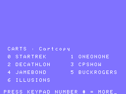 Game Disk #26 (Disk) - Collection of cartridge games includes: Star Trek, One On One, Decathlon, Cabbage Patch Picture Show, James Bond, Buck Rogers, Illusions. Saved in Copycart+ 2.0 format. |