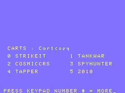 Game Disk #28 (Disk) - Collection of cartridge games includes: Strike It, Tank War, Cosmic Crisis, Spy Hunter, Tapper, and 2010. Saved in Copycart+ 2.0 format. |