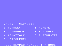 Game Disk #29 (Disk) - Collection of cartridge games includes: Tunnels & Trolls Demo, Popeye, Jumpman Jr., Football, Aquaattack, Gust Buster, and Logic Levels. Saved in Copycart+ 2.0 format. |