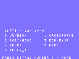 Game Disk #31 (Disk) - Collection of cartridge games includes: Jukebox, Crossforce, Robin Hood, Donkey Kong Jr., Smurf, H.E.R.O. and Telly Turtle. Saved in CopyCart+ 2.0 format. |