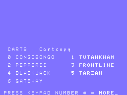 Game Disk #4 (Disk) - Collection of cartridge games includes: Congo Bongo, Tutankham, Pepper 2, Frontline, BlackJack/Poker, Tarzan, and Gateway to Asphai. Saved in Cartcopy+ 2.0 format. |