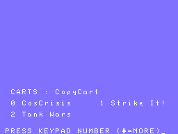 Game Disk #5 (Disk) - Collection of cartridge games includes: Cosmic Crisis, Strike It, and Tank Wars. Saved in Cartcopy+ 2.0 format. |