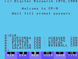 Game Disk #8 (Disk) - Collection of cartridge games includes: Super Cobra (pictured), Donkey Kong Jr., Pitstop, Centipede, Galaxian, Cosmic Avenger, Looping, and Baseball. Saved in CP/M format. |