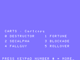 Game Disk #9 (Disk) - Collection of cartridge games includes: Destructor, Fortune Builder, Sector Alpha, Blockade Runner, Fall Guy, and Rolloverture. Saved in Copycart+ 2.0 format. |