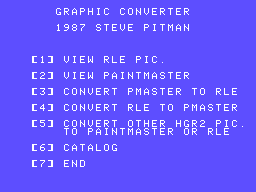 Graphic Converter (Disk) - Converts RLE format pictures to Paintmaster or Paintmaster to RLE. you can also convert any HGR2 picture to Paintmaster. |